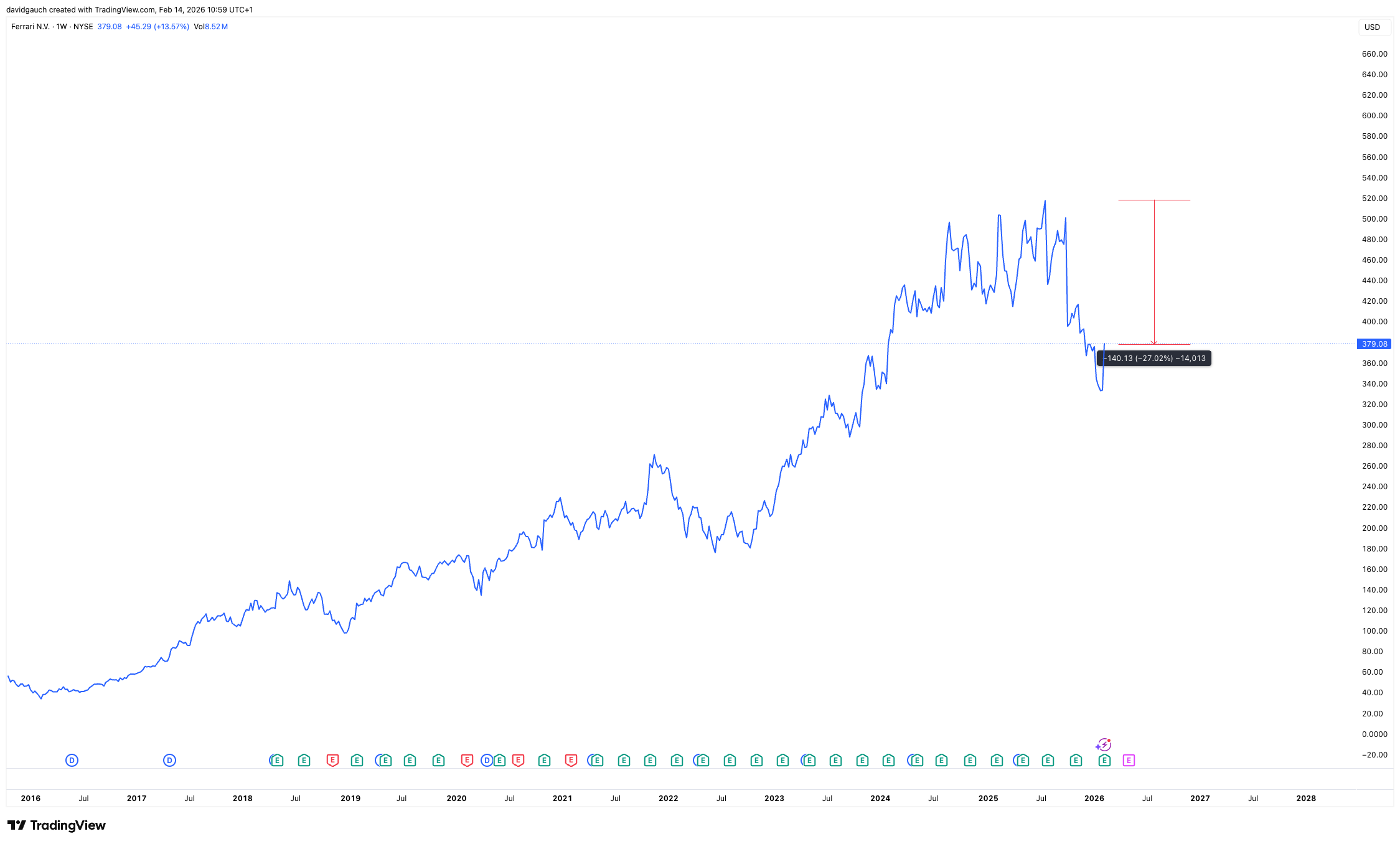In my view, Ferrari could offer attractive diversification for a global portfolio, especially with the stock trading around 27% below its previous all-time high.