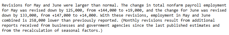 May and June figures were revised down by a whopping 258K. New totals: May = 19K, June = 14K. That, my friend, is not a stable labor market.