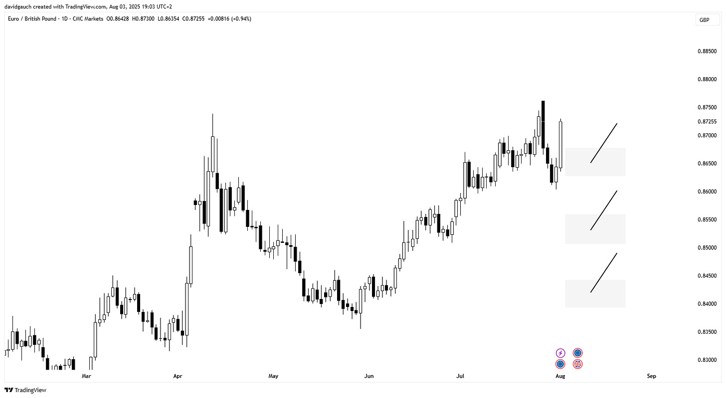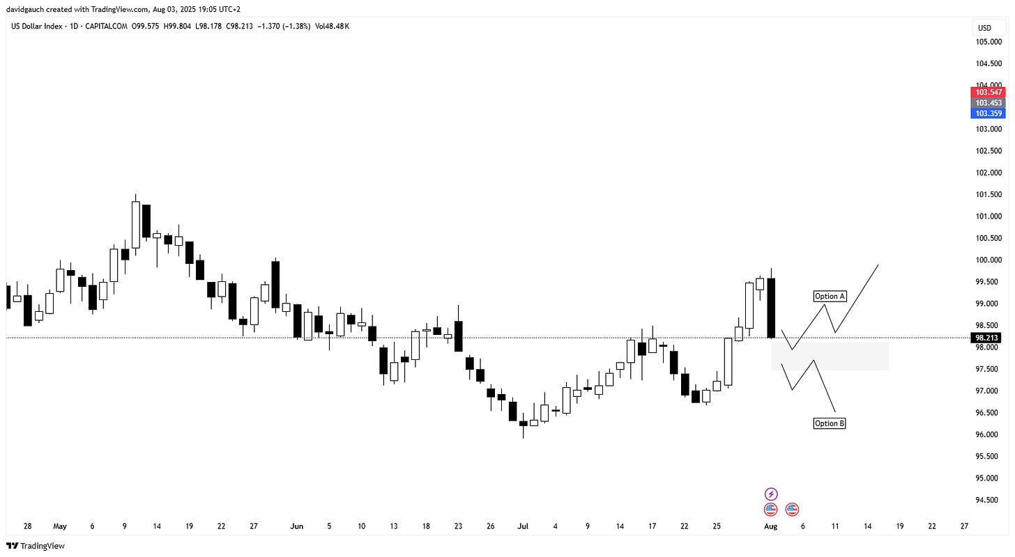 I entered last week with a fairly bullish USD bias and caught some nice upside. Technically, the dollar still looks fine, but I’ll be cautious early in the week (Monday/Tuesday) as markets digest the shock of Friday’s labor data.