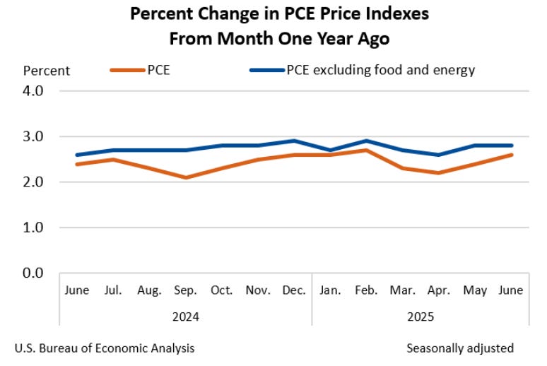 Annualized core PCE (ex-food and energy) is at 2.8%, still far above the Fed’s 2% target. Sticky inflation remains a headache.