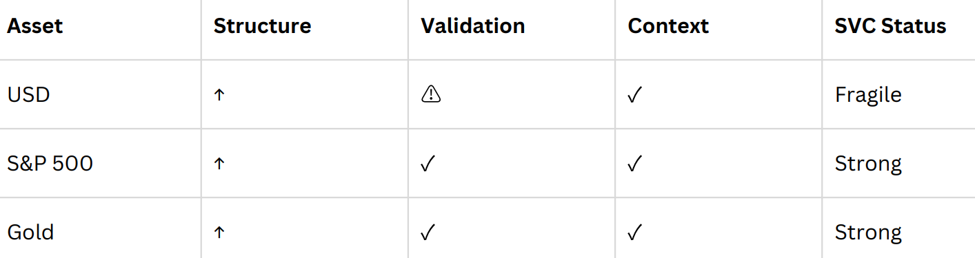 Although our SVC framework has shifted bullish, underlying fundamentals do not support a strong USD trend, leaving this move fragile and highly data-dependent.