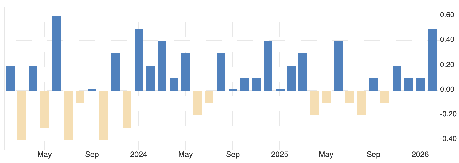 The UK’s GDP grew by 0.5% month-on-month in February 2026, surpassing expectations and January’s revised 0.1% growth. This marks the strongest growth since January 2024, with services contributing 0.5% to the growth (up from 0.1% in January). The largest positive contribution came from administrative and support service activities, which rose by 2.0%. This growth was driven by a rebound in employment activities, which increased by 2.5%, along with gains in wholesale and retail trade and repair of motor vehicles, which saw a 0.7% increase.