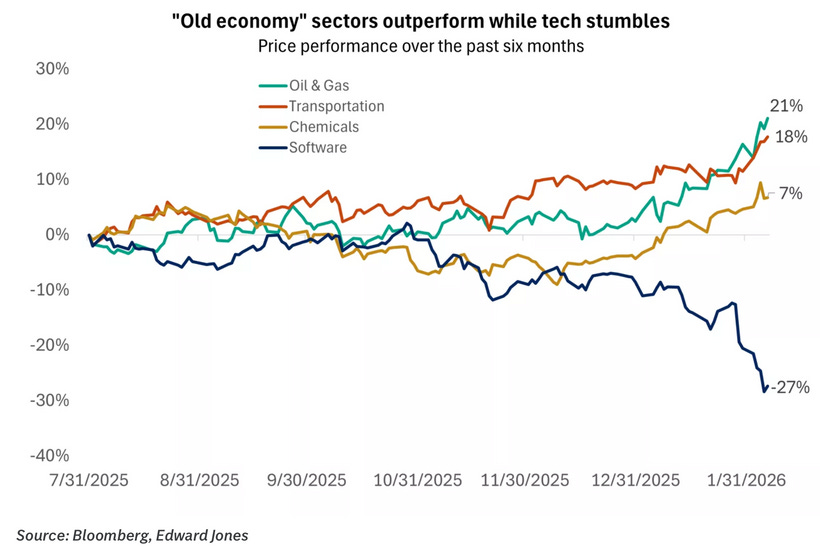 Without Friday’s sharp late-week rally in equities, the S&P 500 would have ended the week down more than 2.0%. At the same time, the sector rotation appears to be continuing, now reinforced by the narrative that advances in AI could ultimately render certain software business models obsolete, the so-called “SaaSpocalypse.” Edward Jones illustrates this dynamic effectively in the following chart: