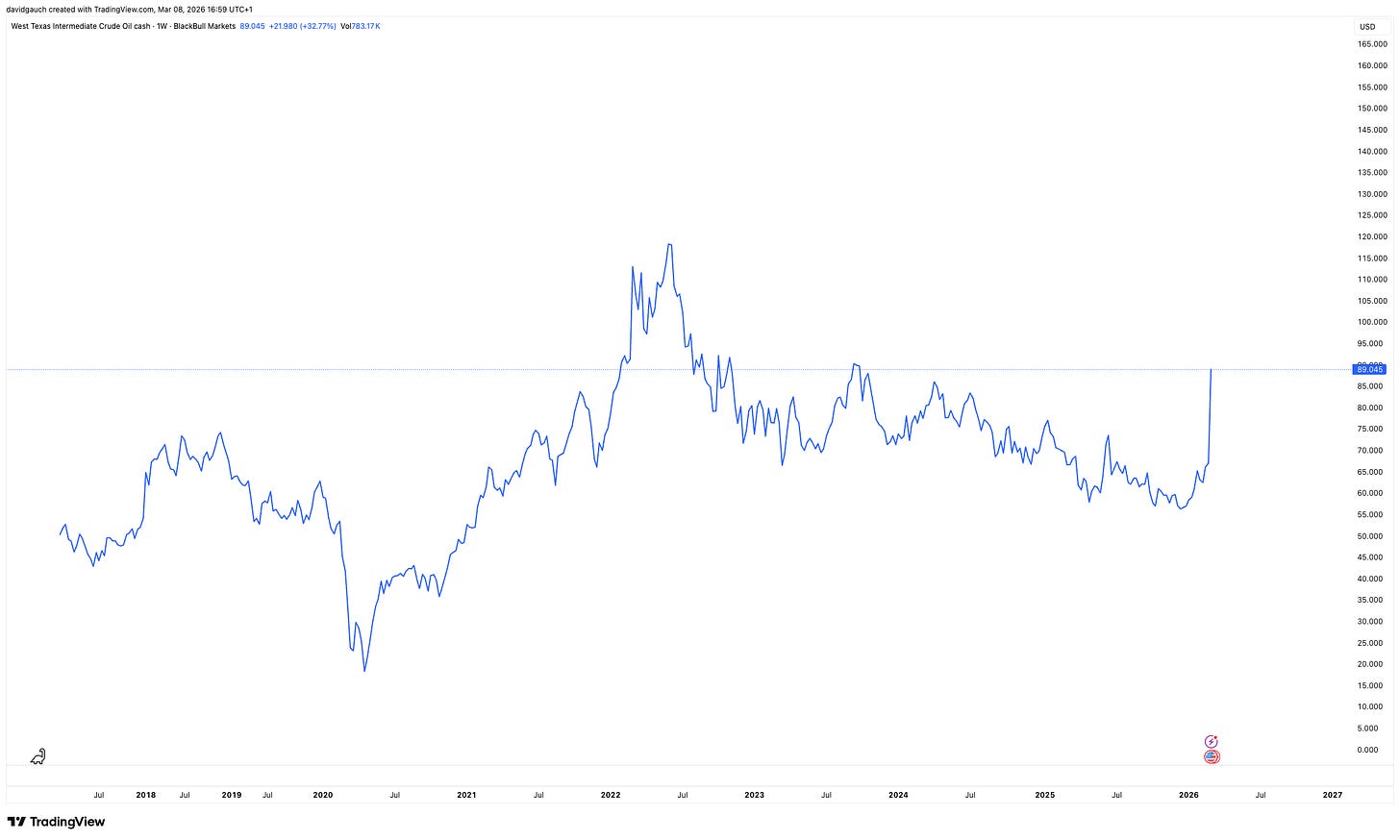 Outside of equities, oil clearly stood out this week. A +32% weekly move in WTI is certainly significant. That said, it is worth remembering that we have seen even more extreme levels during previous episodes in recent years.